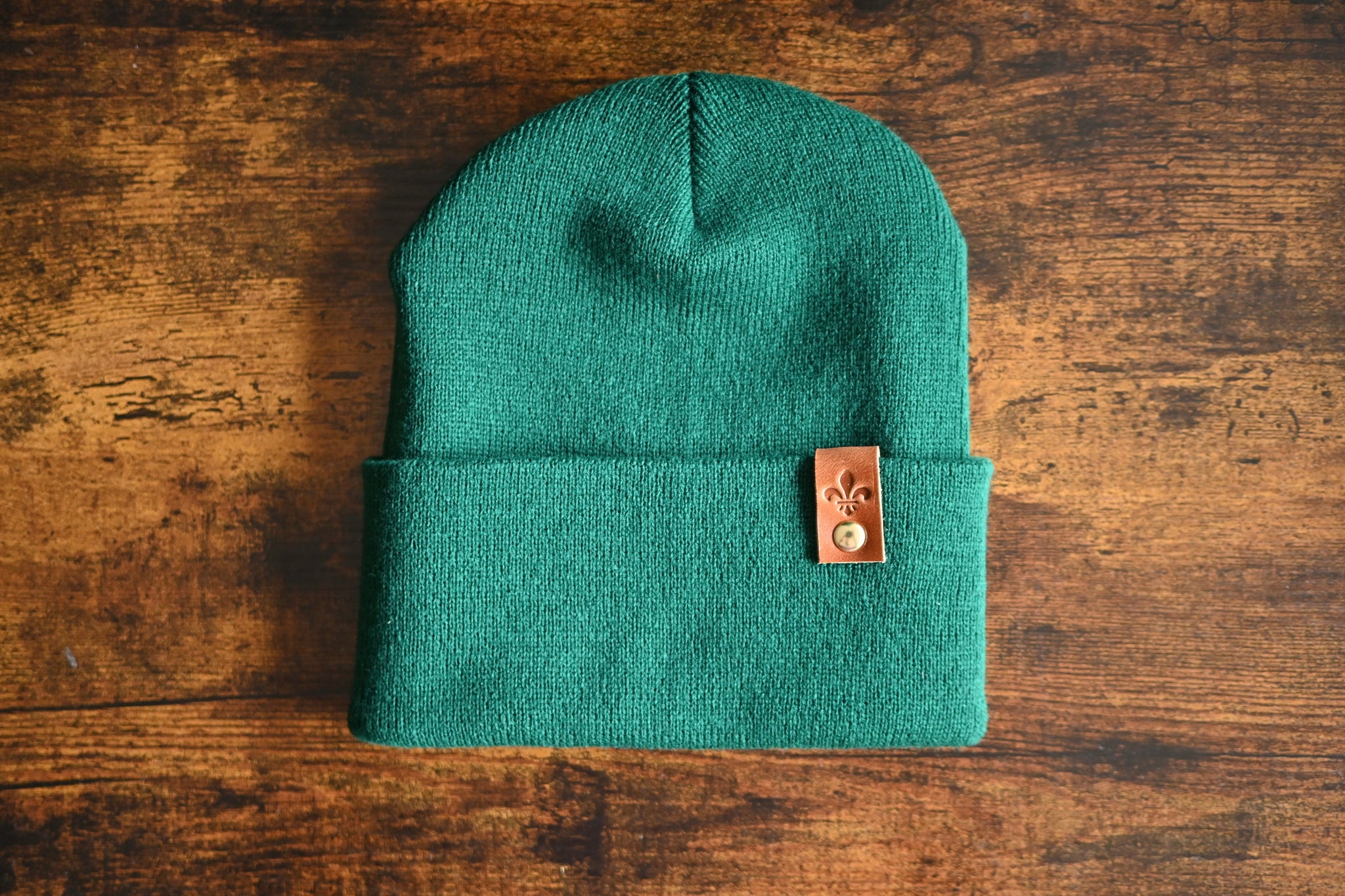 A warm, comfortable beanie with a leather Fleur de Lis patch.